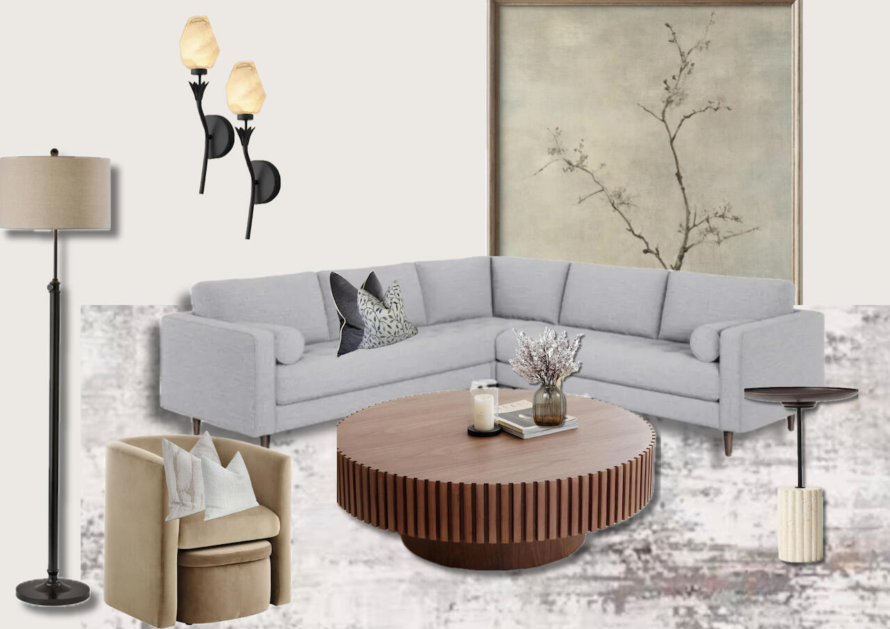 * Key furniture & lighting direction - the pieces that anchor the room